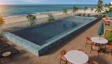 Rooftop Premium: Piscina com borda infinita e vista panorâmica para o mar e o Forte de Tamandaré.